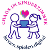 Logo Chaos im Kinderzimmer: zwei Kinder halten Tablet, Pixelherz darüber, Slogan „lernen.spielen.digital“